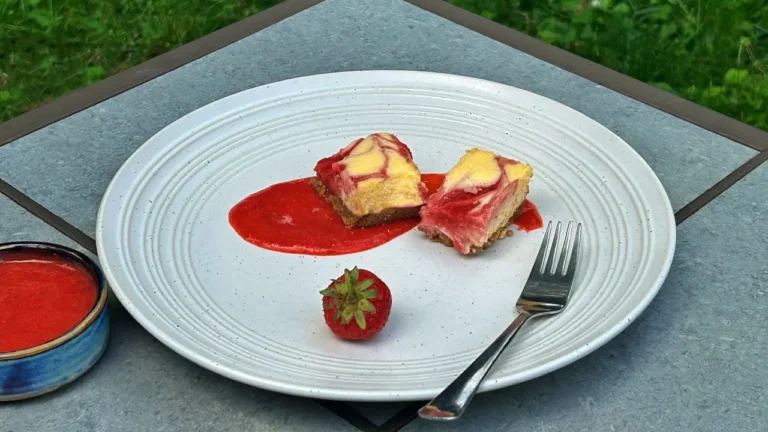 My delectable strawberry swirl cheesecake squares are easy to make and are baked to perfection, ensuring a creamy, dreamy texture.
